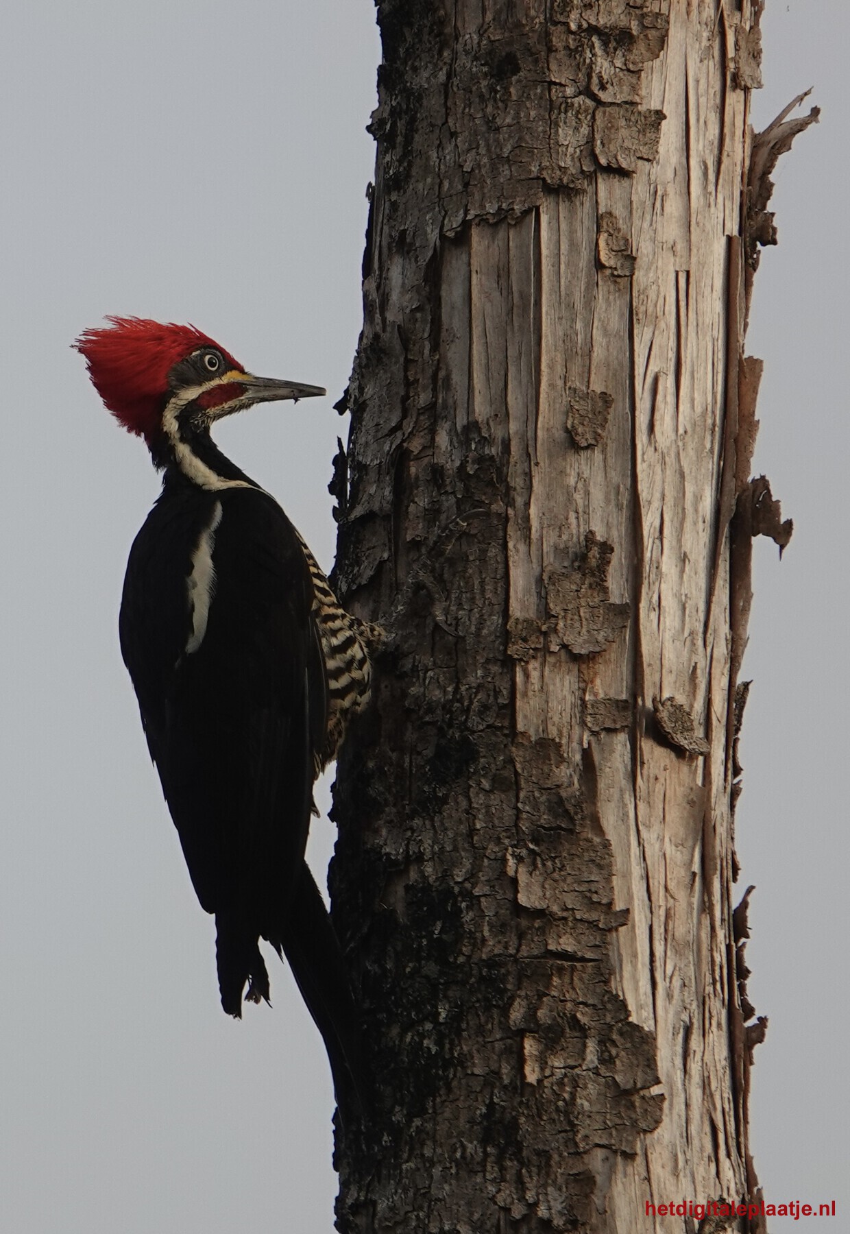 • Toelichting: Hoog tegen een verweerde stam in Suriname houdt de gestreepte helmspecht alles scherp in de gaten. Met zijn felrode kuif steekt hij opvallend af tegen het groene decor. Zelfs in het regenwoud kun je maar beter goed voor de dag komen. :-)