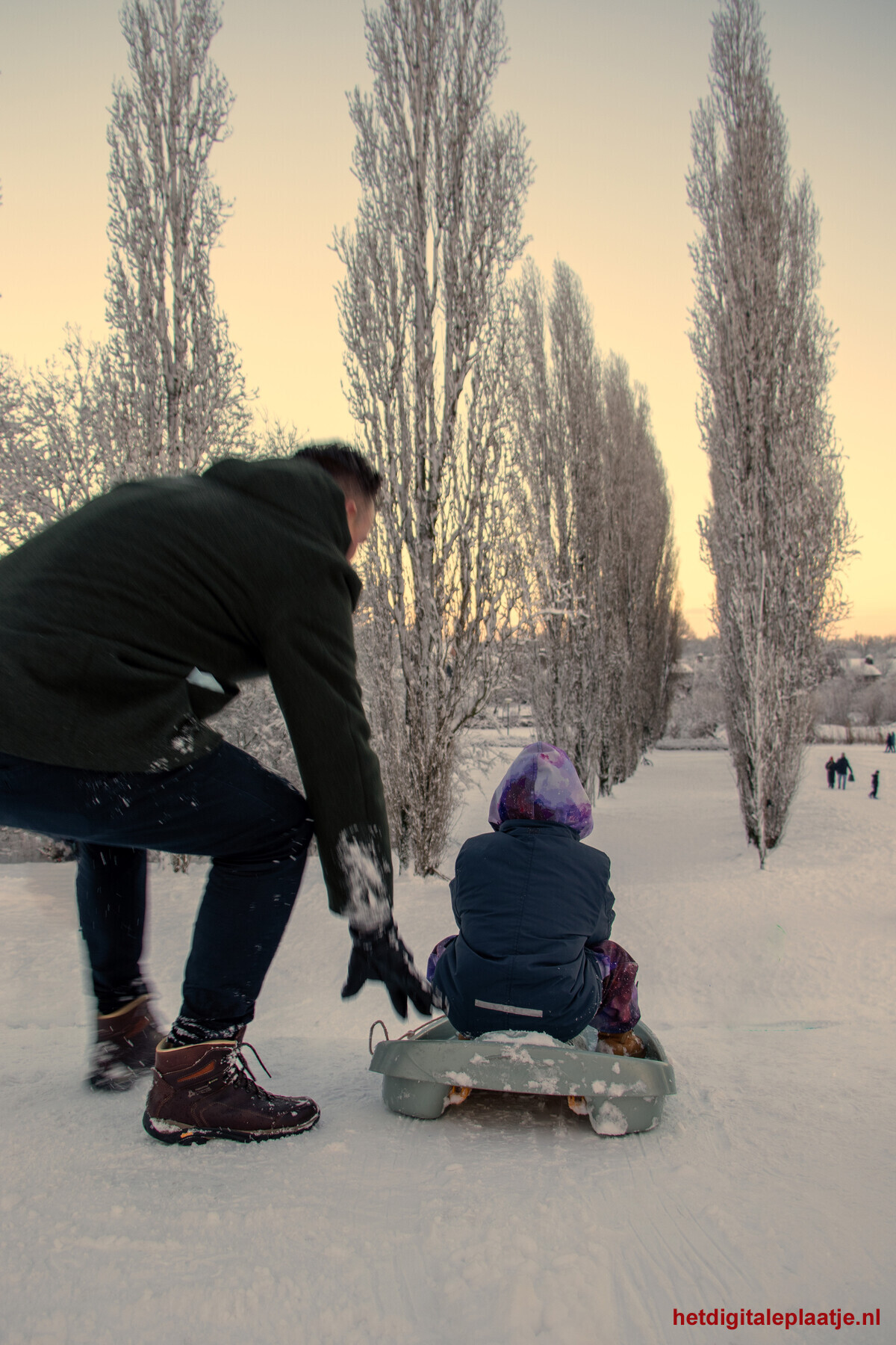 • Toelichting: Lastig thema, want je kan er veel kanten mee op. Ik was foto's aan het maken van de sneeuw in het park, totdat ik heel veel mensen tegen kwam op de heuvels in het park, waar ouders de kinderen een duwtje geven zodat ze naar beneden kunnen sleeën. In deze foto zie je de onscherpte van de vader op het moment dat hij zijn zoontje een duwtje geeft. Duidelijk het BEGINPUNT van de afdaling.
