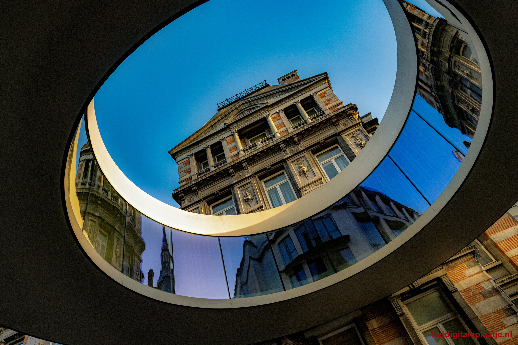- Toelichting: De voetgangersbrug Tondo, ontworpen door Office Kersten Geers David Van Severen en Bollinger+Grohmann (B+G), ligt ingeklemd tussen een negentiende-eeuwse classicistische gevel en een eenentwintigste-eeuwse poging tot postmodernisme, en biedt de stad een robuust stuk infrastructuur. Het project verbind het Belgische federale parlement en het Forumgebouw met elkaar, een hoogteverschil van 90 cm over minder dan 15 m overbruggen, rolstoeltoegankelijk zijn en zo min mogelijk impact hebben op de bestaande architectuur. De architecten stonden kritisch tegenover de nieuwe geometrieën die vaak voor dit soort projecten worden voorgesteld en keerden terug naar de klassieke, geometrische vorm van de perfecte cirkel. Het cirkelvormige plan kon met één enkel gebaar inspelen op de belangrijke en tegenstrijdige beperkingen en tegelijkertijd een sterke en autonome vorm creëren. ‘Als je tussen twee gebouwen moet bemiddelen, kun je dat alleen tangentieel doen. Dus draai je de vraag om en creëer je een ideale wereld die op zichzelf staat’, leggen de architecten uit. Tondo is zo’n omgeving. Verwijzend naar de cirkelvormige tondo-schilderijen van renaissancekunstenaars als Rafaël, Botticelli en Michelangelo, presenteert het gelijknamige project zich als een ruimtelijk element, een entiteit met eigen autonomie.