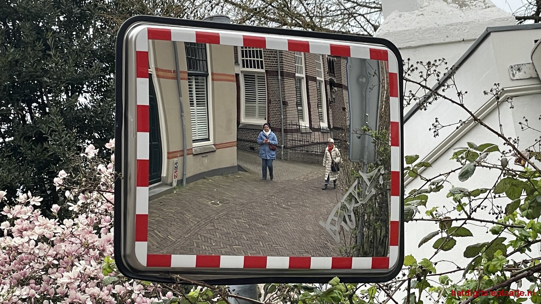• Toelichting: Dames in de dode hoek geframed tijdens een stadswandeling.