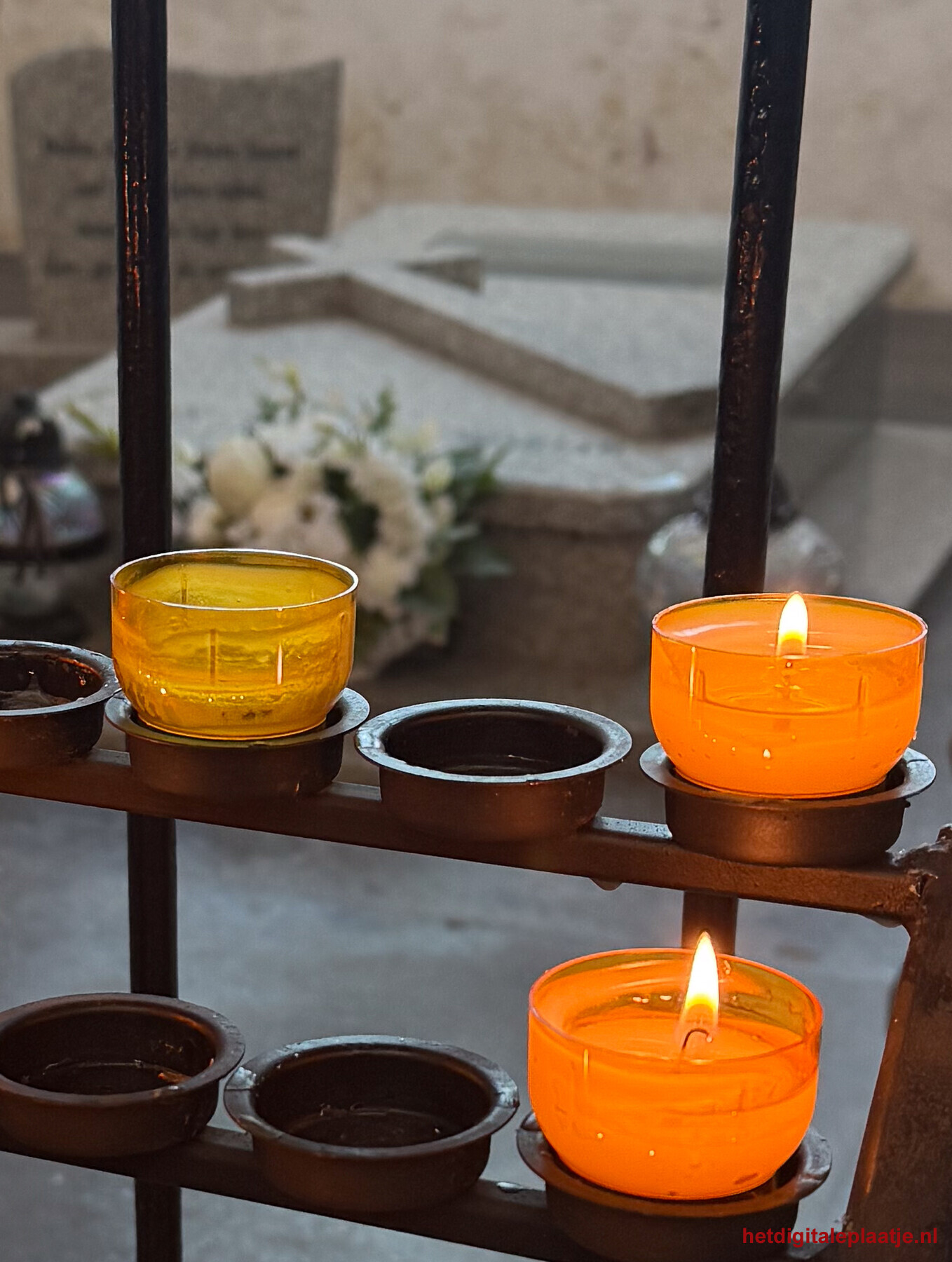 • Toelichting: De brandende kaarsjes, in combinatie met het graf op de achtergrond, geven mij het gevoel dat ze branden als herinnering aan degenen die er niet meer zijn. Het kaarsje dat wel heeft gebrand, maar nu uit is, versterkt voor mij nog meer het gevoel van afwezigheid.