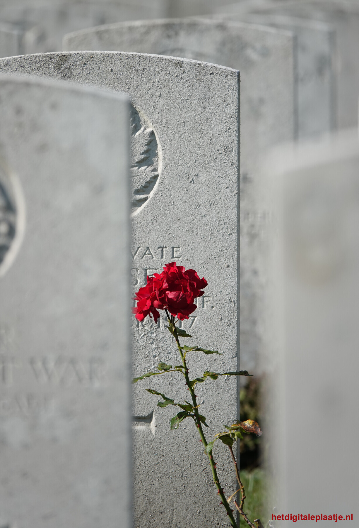 • Toelichting: Tussen rijen van stilte staat één rode roos. Ze bloeit waar woorden zwijgen – een kort moment van leven, tegenover de eeuwigheid van herinnering. Vergankelijk, maar niet vergeefs.