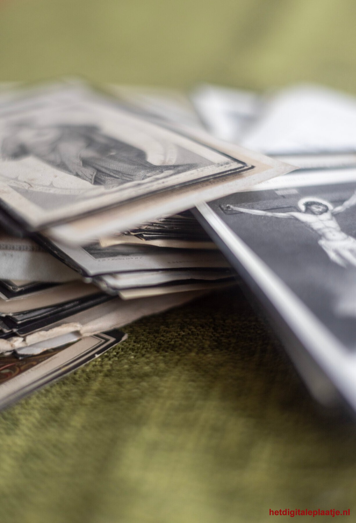 • Toelichting: In de vage contouren van vergeelde bidprentjes schuilt een fluistering van tijd. Elke afbeelding draagt de sporen van handen die ze vasthielden, van ogen die ze ooit bestudeerden in momenten van hoop of verdriet. De zacht vervagende randen vertellen niet alleen een religieus verhaal, maar ook dat van herinneringen die langzaam oplossen in de stilte van het heden. Dit stille stapeltje papier wordt zo een monument van vergankelijkheid – een echo van levens die ooit met zorg herdacht by werden.