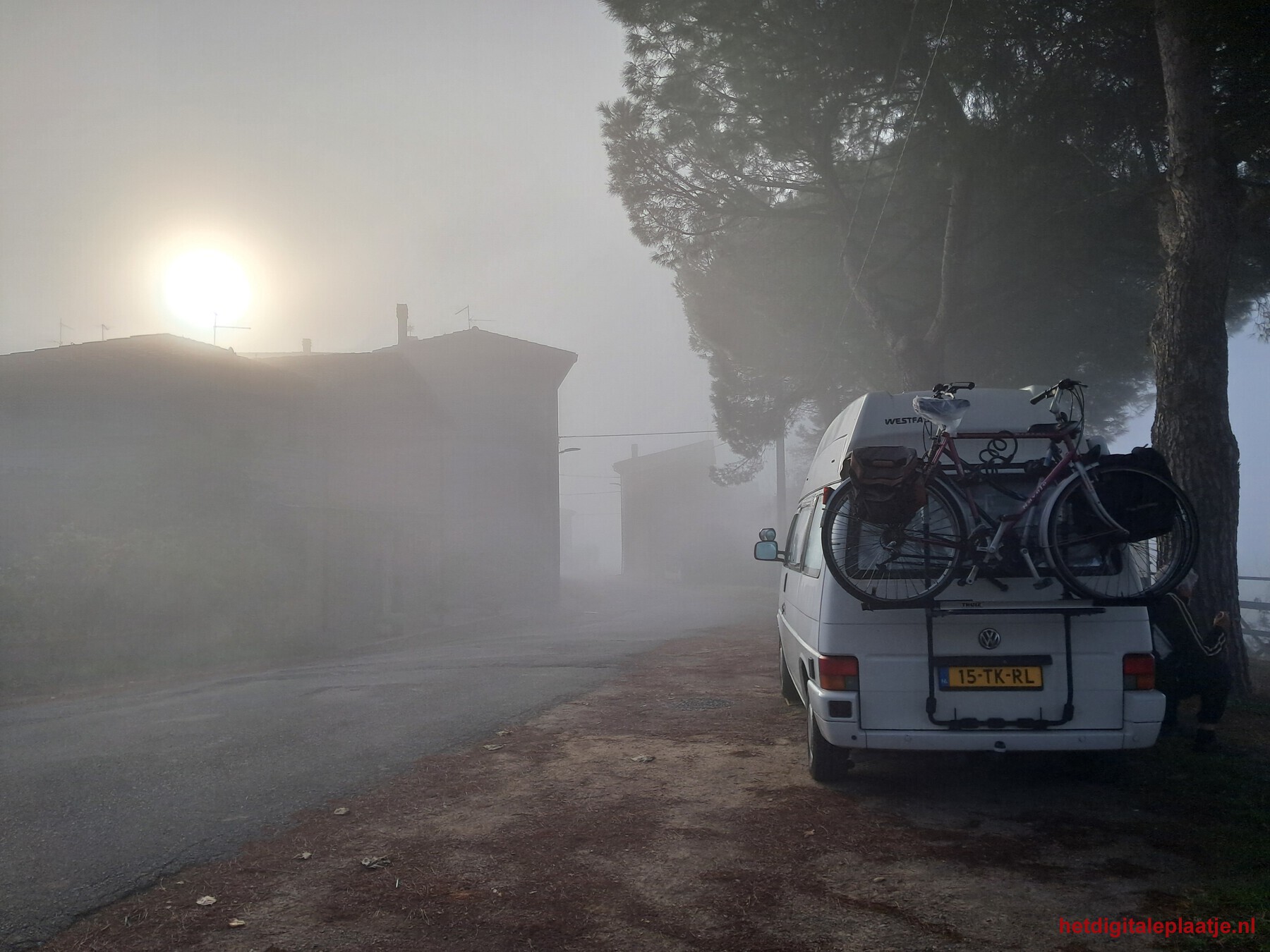 - Toelichting: We hadden een heerlijke slaapplek in een gehuchtje in Italië. Met uitzicht op het meer, en bij het wakker worden weinig zicht dus. Maar dit heeft ook wat.