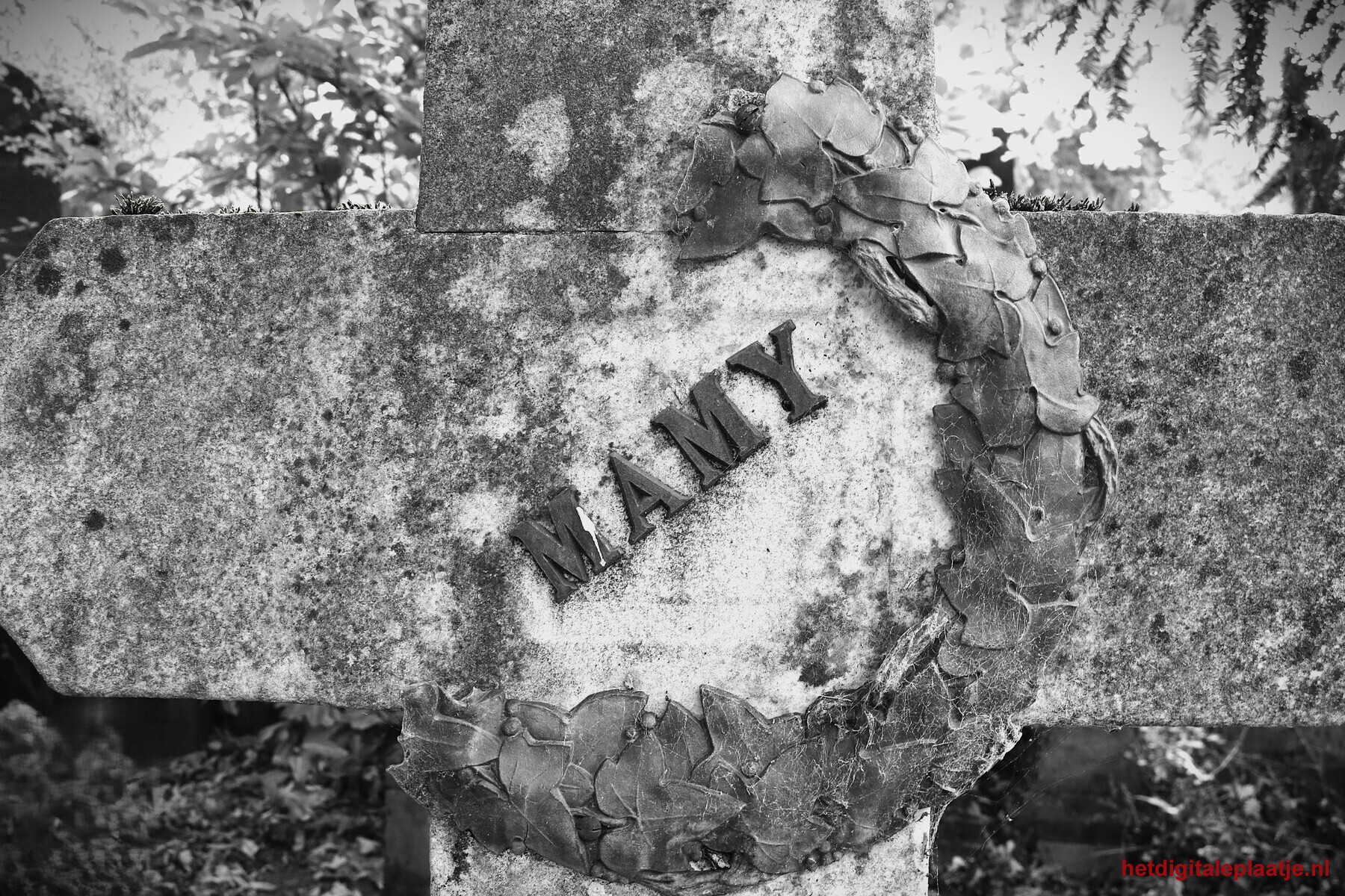 - Toelichting: oen ik deze grafsteen fotografeerde, raakte me vooral het woord “MAMY”. De steen is bedekt met mos en vlekken van erosie, de metalen krans van bladeren is gedeeltelijk vergaan en overwoekerd door spinnenwebben. Alles wijst erop dat de tand des tijds onverbiddelijk voortschrijdt: wat ooit zorgvuldig werd neergelegd om een geliefde te eren, wordt nu langzaam opgeëist door de natuur. De vergankelijkheid zit hier in meerdere lagen: niet alleen het leven dat voorbij is, maar ook de menselijke herinnering en symbolen, die ooit sprankelend en levend waren, zijn nu aangetast en vervaagd. Toch schuilt er ook schoonheid in dit proces — de verweerde steen en de roestige krans vertellen een verhaal van tijd, liefde en loslaten.