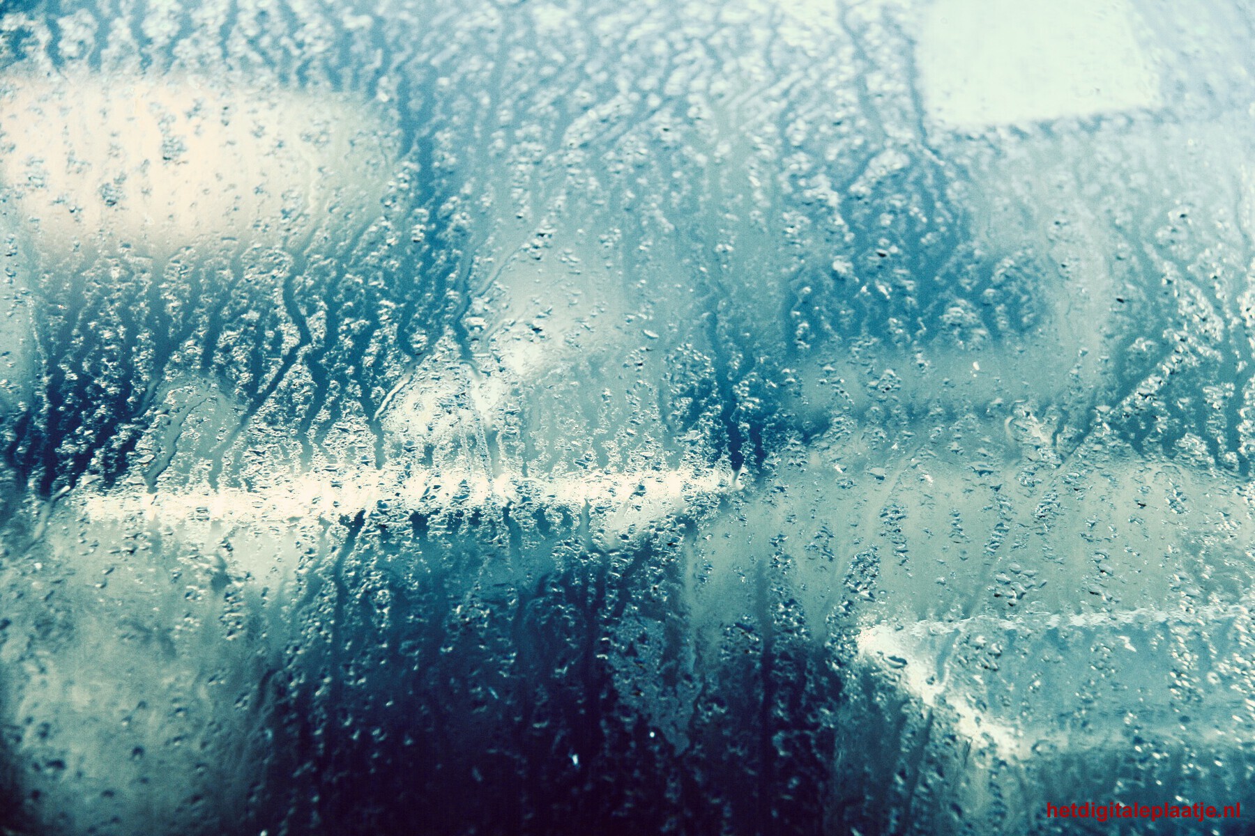 Het was een ochtend met heel veel zonneschijn met de de weerkaatsing van de blauwe heldere lucht op de ruit met de afdruppende waterdruppels.