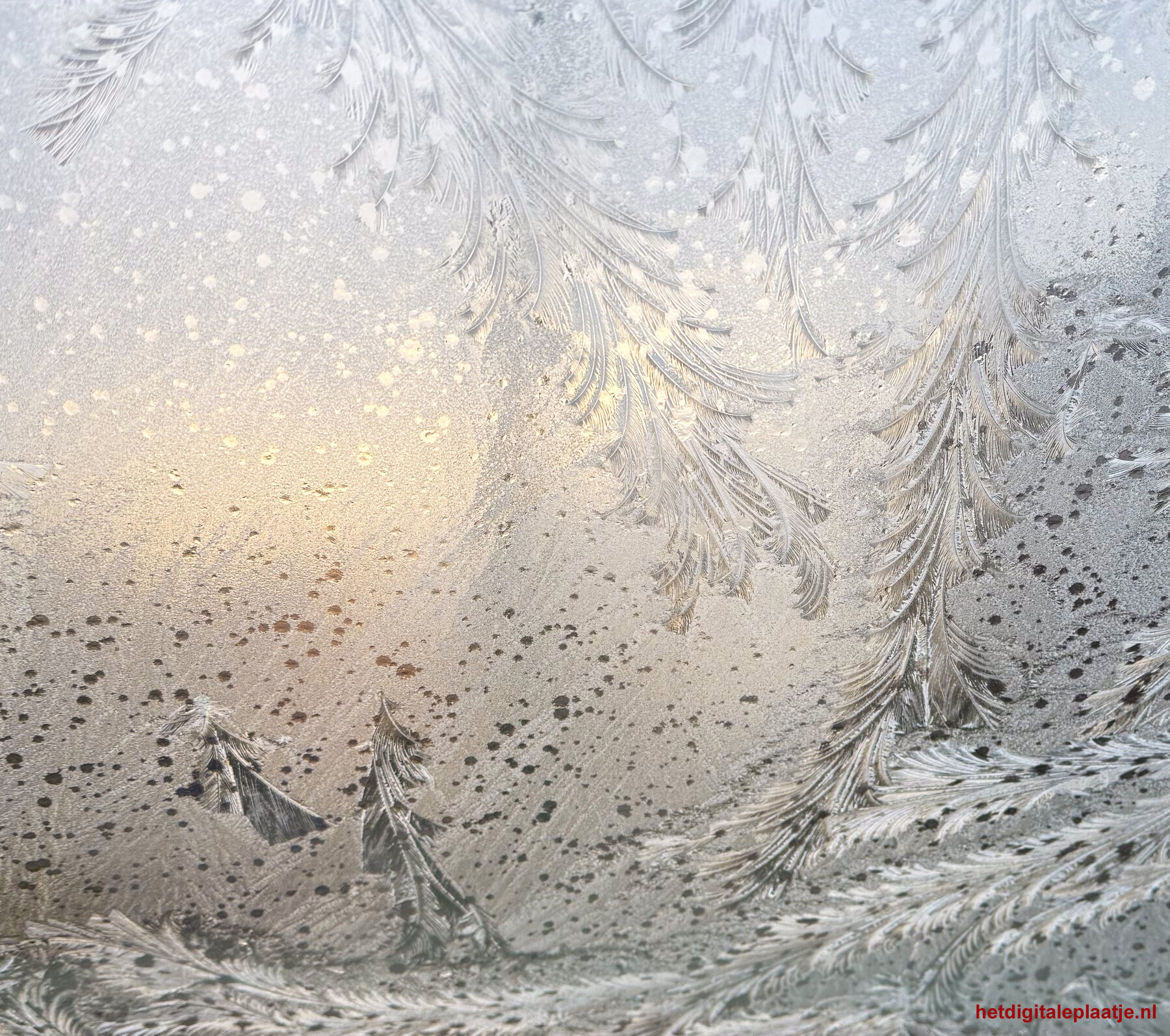 • Toelichting: In de ochtend en iets aparts. Had meerdere dingen geprobeerd tot ik op een ochtend de auto instapte en dit op mijn voorruit zag. Eerst zag ik alleen de ijsbloemen. Maar na langer kijken werd dit een landschap met hoge bomen en struikgewas, waar twee figuren (links onderin) zich door de vallende sneeuw een weg baanden. Bijna zonde om te krabben :-)