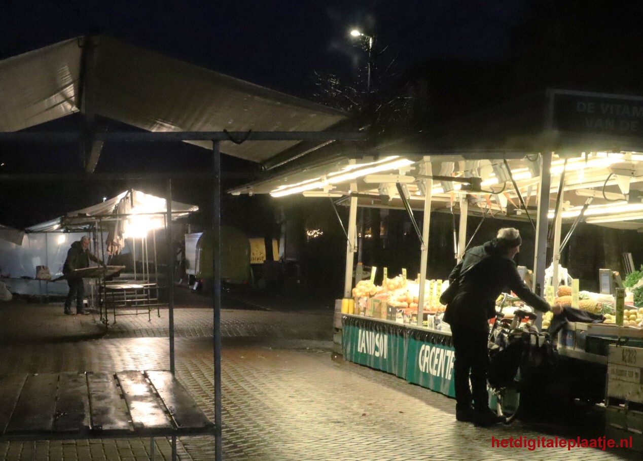 - Toelichting: Opbouw en start van de markt. Het is nog donker, en kil en nat.