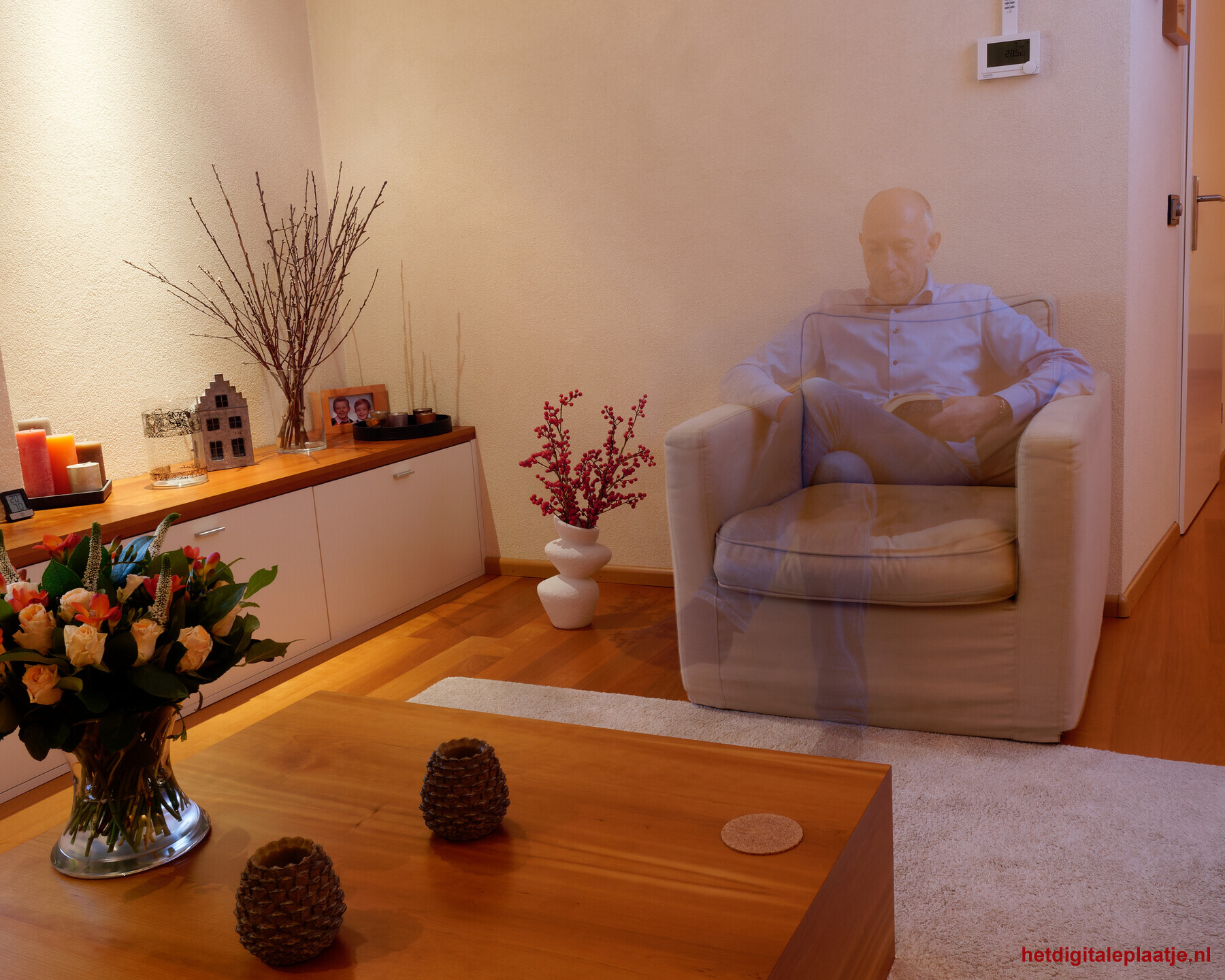 • Toelichting: Als ik een boek lees, dan hoor ik ook niet zoveel meer, ik ben maar half aanwezig, ofwel half afwezig. Dat thema heb ik in deze foto verwerkt. Een lange sluitertijd gekozen, klein diafragma om weinig licht in te laten en een flash (niet op de camera), die met de hand bediend werd. Tijdens de 4 seconden sluitertijd geflasht terwijl ik zat, daarna snel weglopen en de rest van de belichting zonder flash en zonder dat er iemand zat. Daardoor ontstaat het transparante beeld.