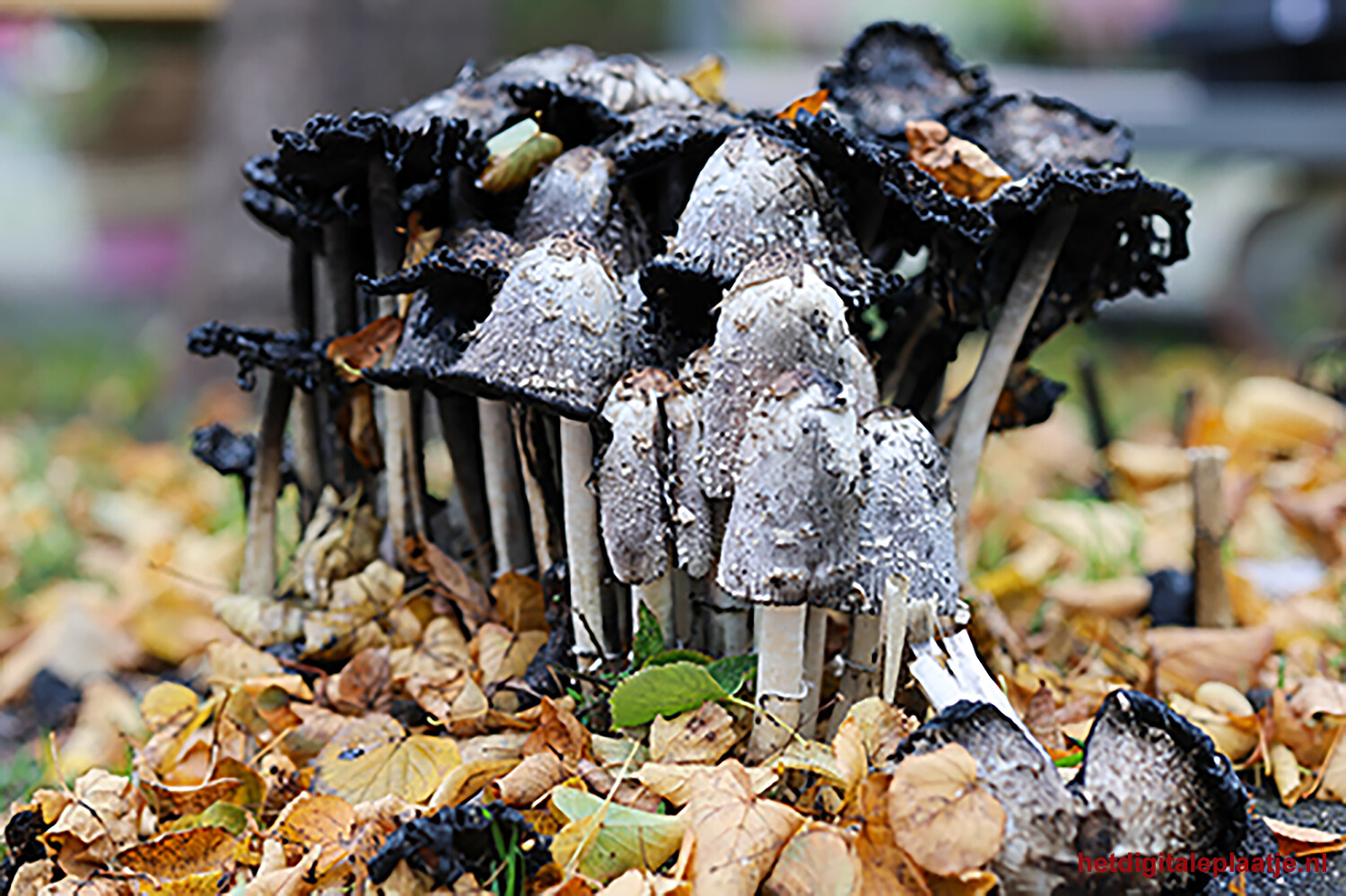 - Toelichting: Geschubde inktzwammen, sommigen al vergaan.