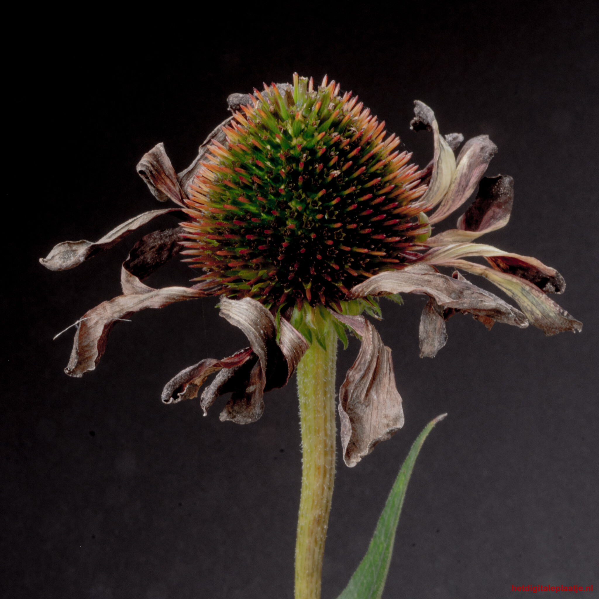 • Toelichting: De zonnehoed is in de winter prachtig als de bladeren er af zijn en de 'bolletjes' overeind staan. In de herfst zie je 'm langzaam zijn bladeren loslaten.De foto is gemaakt tegen een zwarte achtergrond.