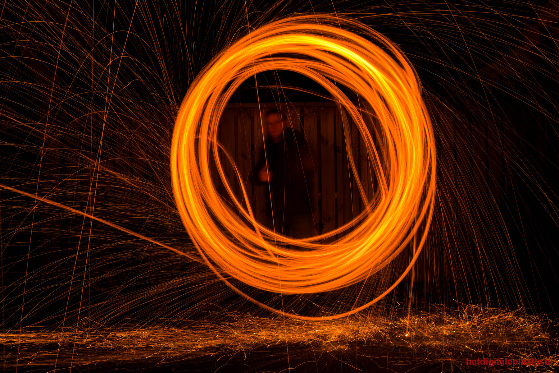 - Toelichting: Met een lange sluitertijd in bulbstand en draaiende staalwol is het licht zelf het onderwerp geworden. De cirkel en de vallende vonken tekenen zich af tegen de duisternis, waarbij beweging en stilte samenkomen. Ik ben bewust slechts vaag zichtbaar, als onderdeel van het licht en niet als hoofdrolspeler